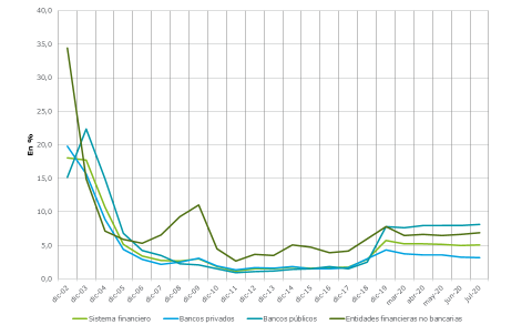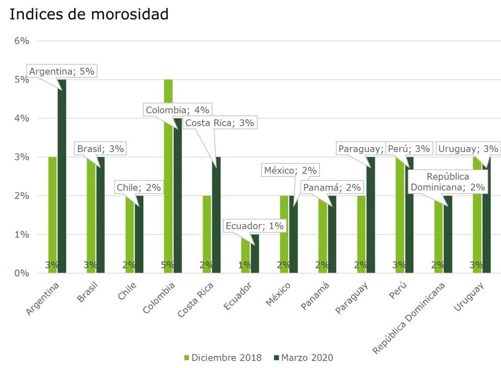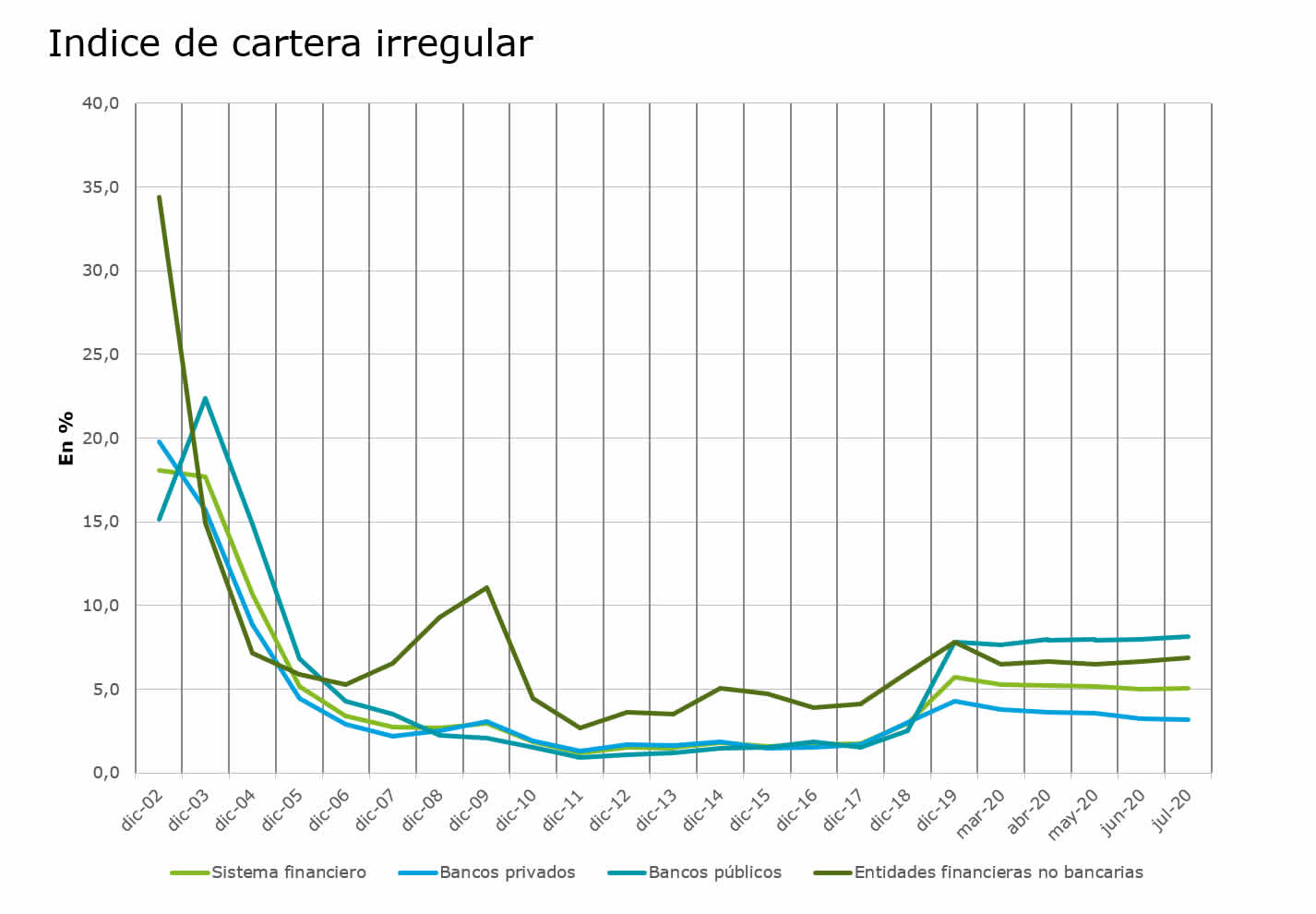En general vemos un crecimiento significativo en 2018 y 2019, con una estabilización en el 2020. Respecto del 2020, las medidas de refinanciaciones de saldos de tarjetas, congelamiento de créditos UVA, extensión del cómputo de los días de mora para los primeros tramos de la cartera sujeta a previsionamiento, más la suspensión de la inhabilitación de cuentas corrientes y las suspensiones de los procesos concursales y ejecuciones, hacen que los niveles de mora se mantengan relativamente estables. No obstante, los índices deberían volver a crecer una vez que estas medidas de ayuda y estímulo se discontinúen. Aquí lo que podría hacer bajar el promedio es un crecimiento en nuevas financiaciones, que produzcan un “refresh” o rejuvenecimiento de las carteras de crédito. Sin embargo, a hoy los únicos créditos que crecen son los que se otorgan a tasa subsidiada.