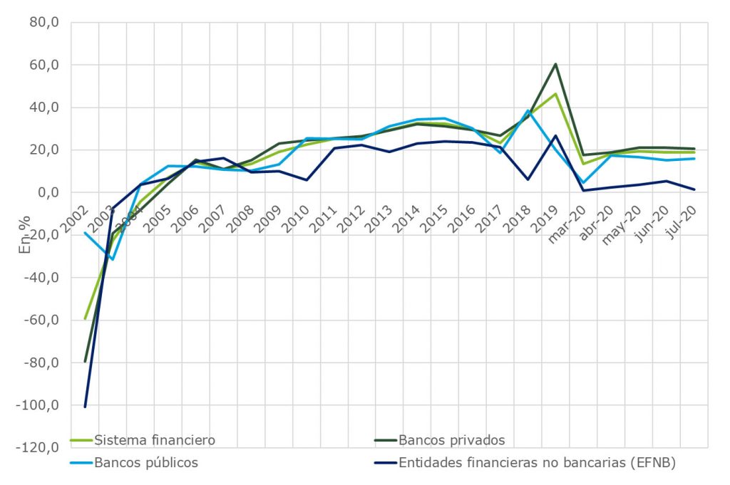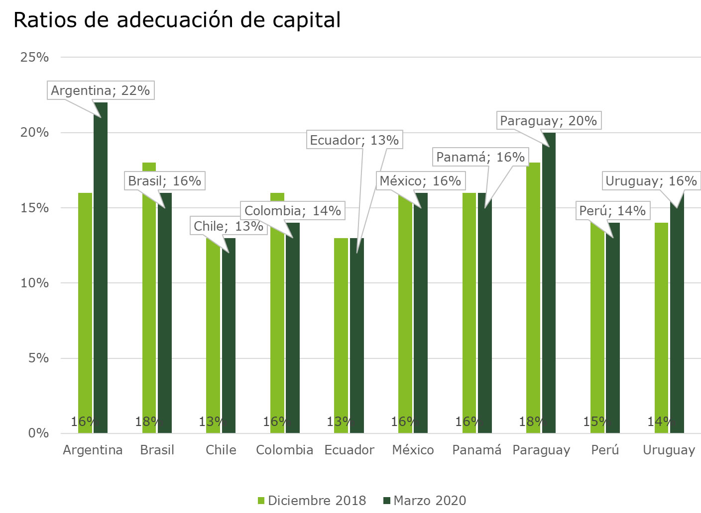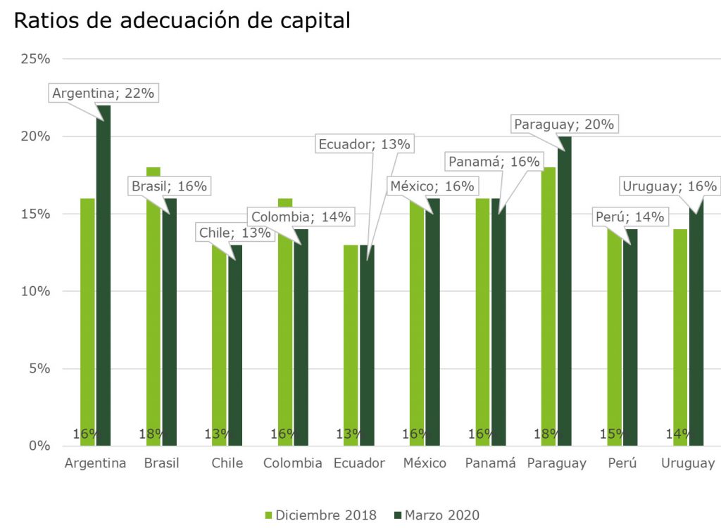 Para poder responder estas preguntas debemos tener benchmarks contra los cuales comparar, y acá surgen varias dimensiones de análisis. Uno es el análisis contra otros momentos de la economía, tanto adversos como de prosperidad. Otro tipo de análisis es más coyuntural, es decir cómo evoluciona la situación de los bancos en los últimos meses, es decir en la inmediatez, en el epicentro de los acontecimientos. Y una tercera dimensión de análisis es la comparación con los otros sistemas financieros de la región, muchos de los cuales están sujetos a riesgos y marcos macro similares (medidas de aislamiento, devaluación de monedas emergentes, flight to quality, etc.).