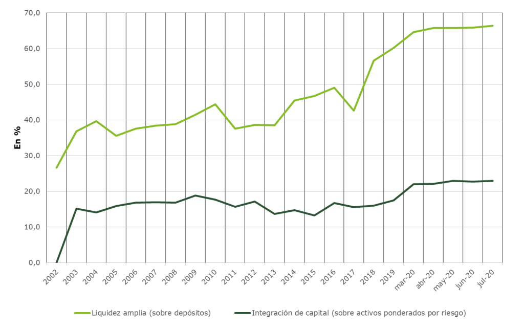 En el análisis más coyuntural, podemos apreciar un aumento en el indicador de adecuación de capital a partir de enero 2020. Esto obedece en parte a la aplicación del ajuste por inflación, que en general provoca un crecimiento del total del patrimonio neto (con cambios en la composición de sus partidas, pero con un efecto neto de aumento del patrimonio).